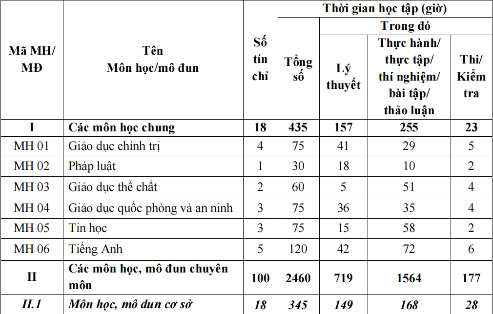 Tổng thời lượng học: 2895 giờ (tương đương 118 tín chỉ)